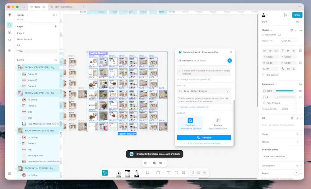 Clones selected frames/nodes, positions them to the right with a 40px gap, applies translations to the clones. Preserves originals. Works with multiple frame selection.