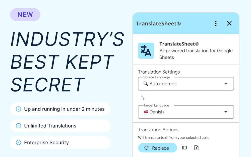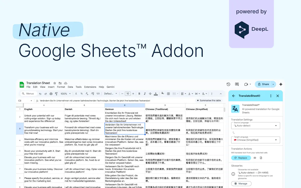 TranslateSheet is the most feature-complete Google Sheets add-on for DeepL, built with a unique hybrid architecture for Google Workspace Addons that solves the limitations of traditional custom formulas or Apps Script-only addons.